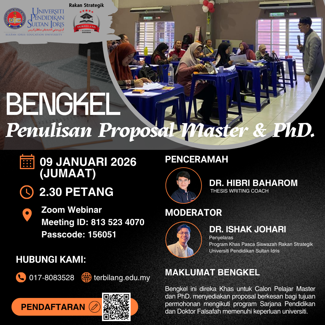 Jemputan ke Bengkel Penulisan Proposal Permohonan Kemasukan Program Khas Sarjana Pendidikan (M.Edu) & Doktor Falsafah (PhD). Kepada yang bakal Pelajar/Calon-calon Master & PhD. ambilan Mac/April 2026 dijemput hadir.